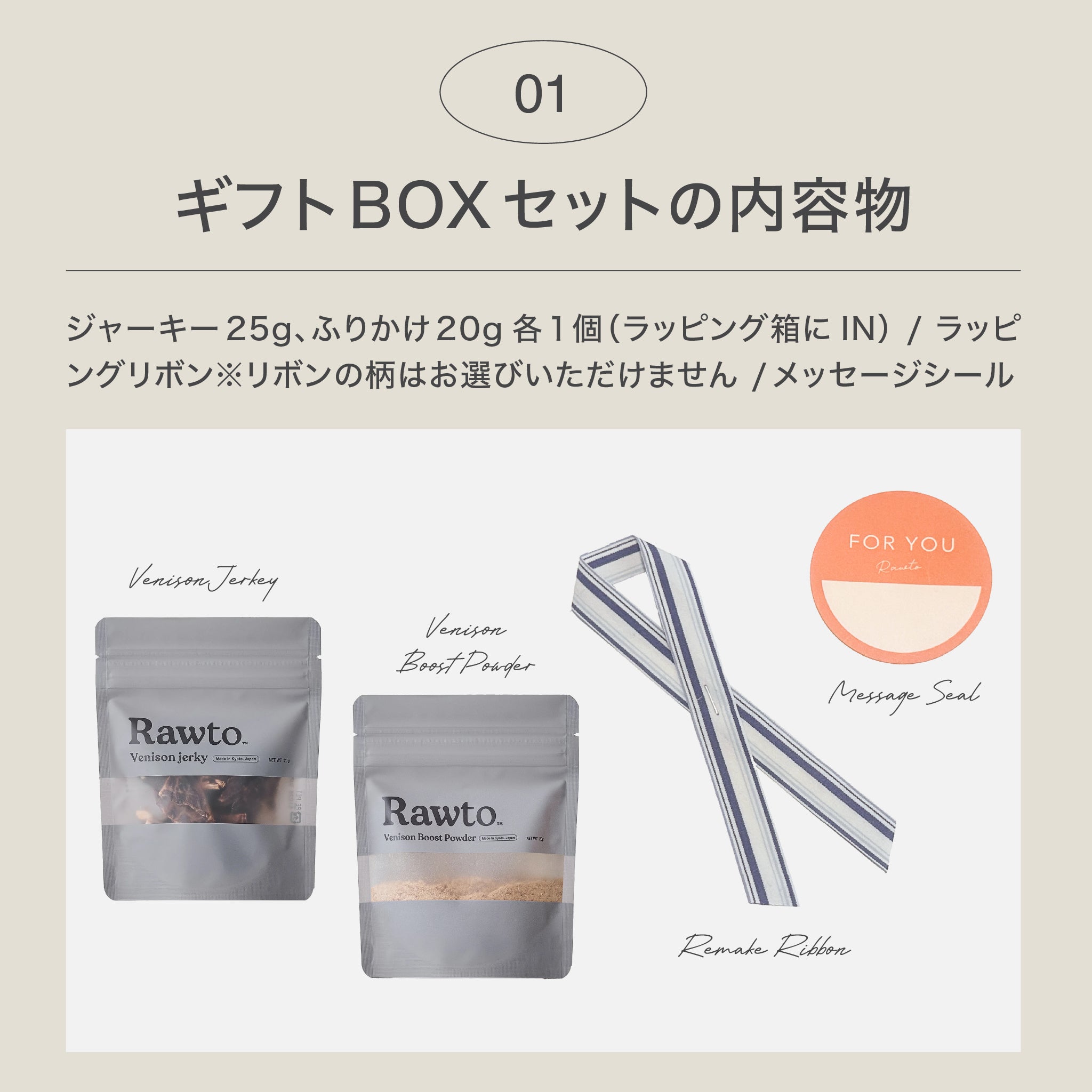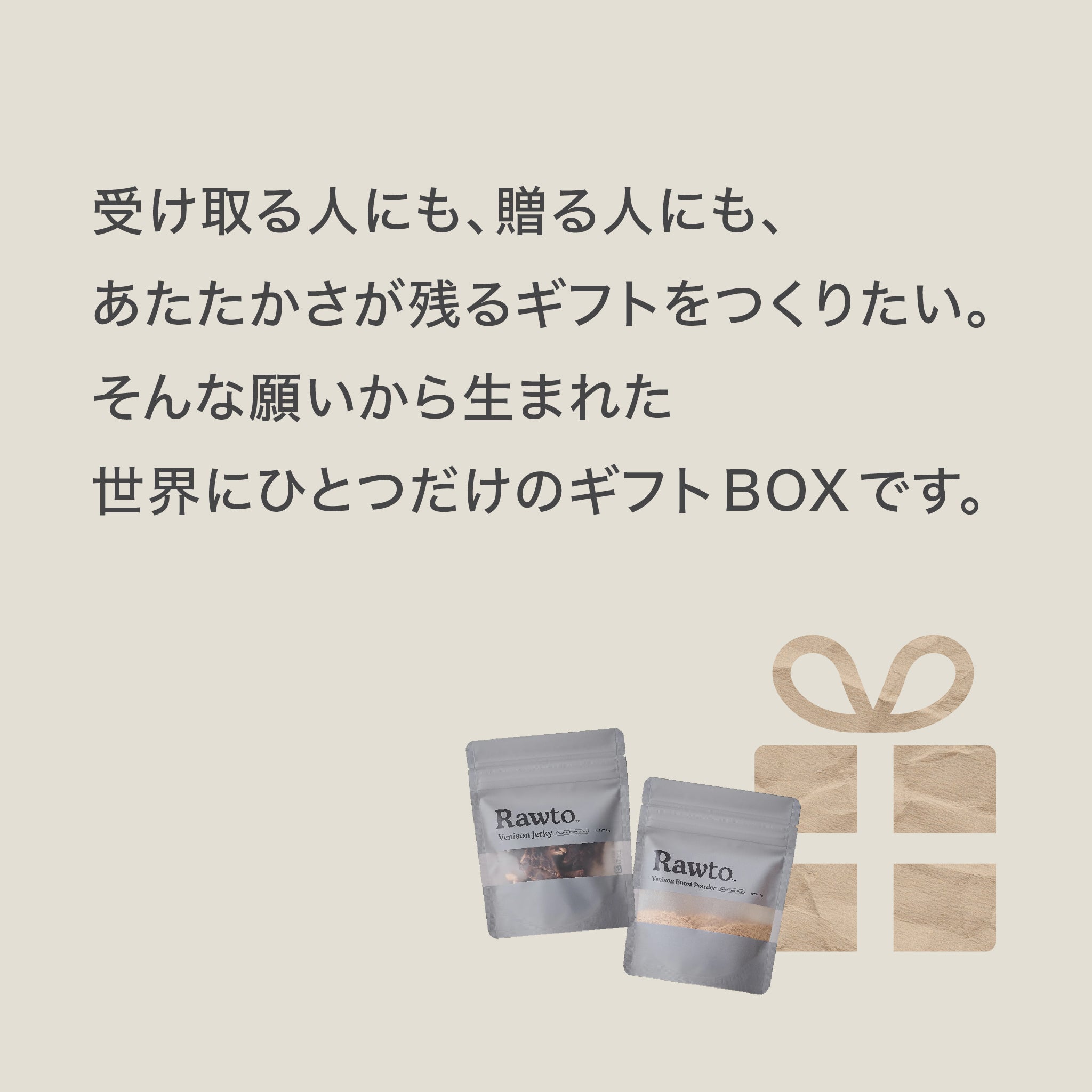 Rawtoのジビエジャーキーとブーストパウダーがセットに。贈る人も受け取る人も心が温かくなる、特別なギフトボックスです