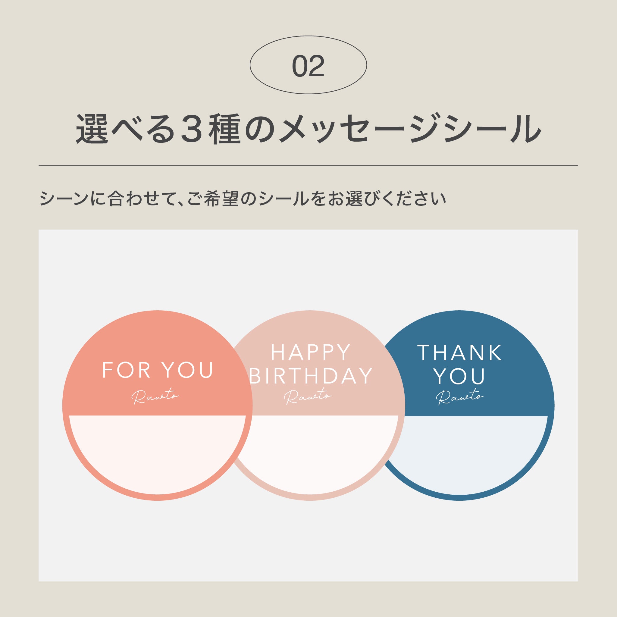 メッセージシールは【FOR YOU / HAPPY BIRTHDAY / THANK YOU】の3種からお選びいただけます。