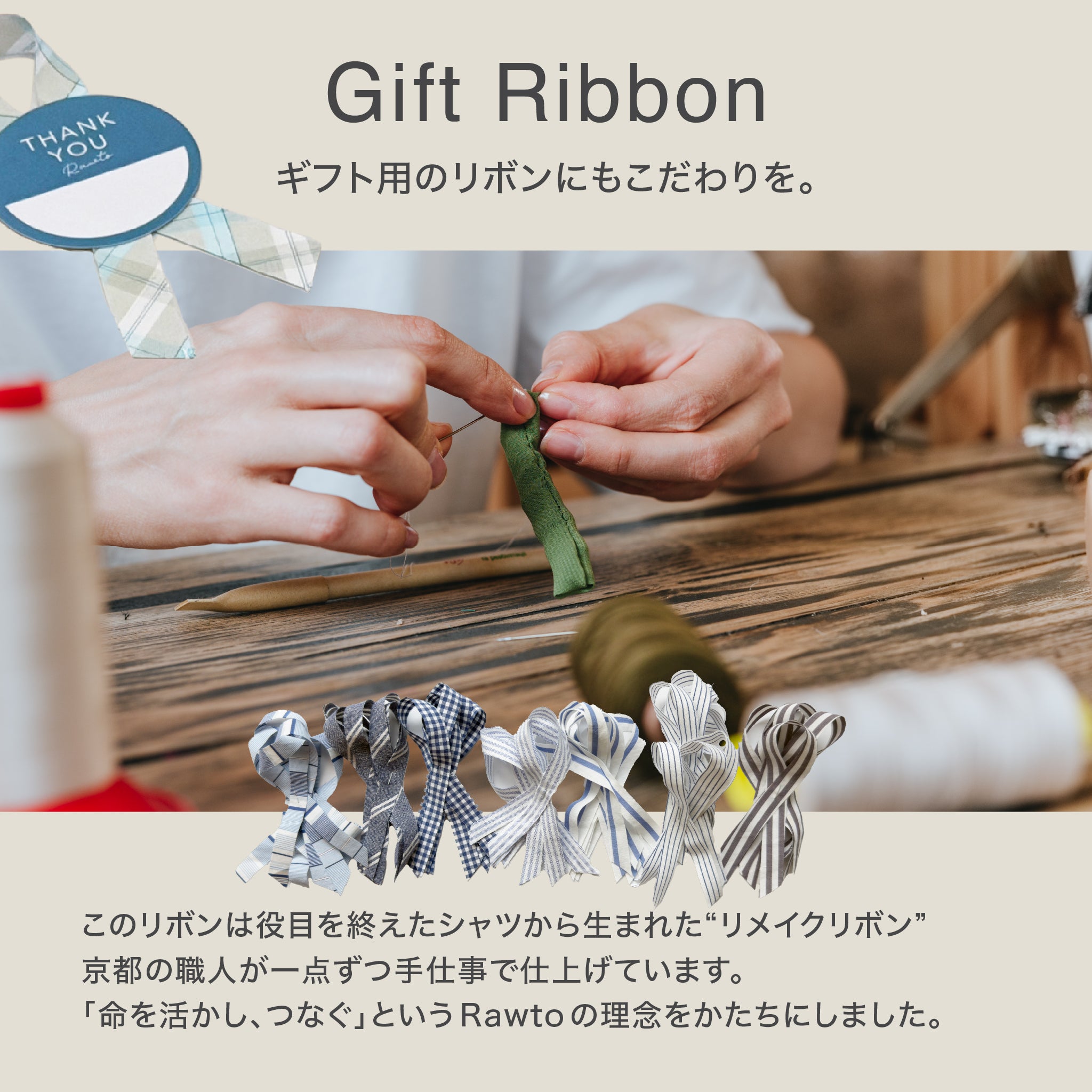 リメイクのリボン: 役目を終えたシャツから生まれた「リメイクリボン」を、京都の職人が一つずつ手仕事で仕上げています。環境に配慮し、「命を活かし、つなぐ」という理念を形にしました。